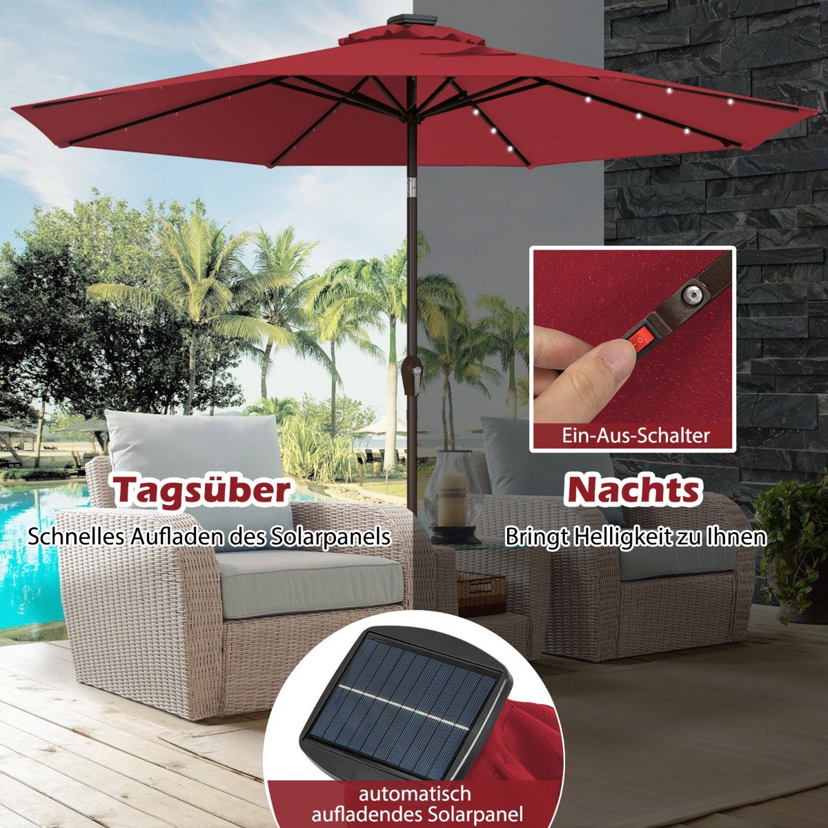 LED Beleuchtung Ampelschirm rund Sonnenschirm Solarbetrieben Gartenschirm Kurbel-rot- 3M€99,99