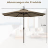 Der Sonnenschirm ist idealer Schattenspender für Balkon, Garten, Markt, Strand, Terrasse. Er bietet optimalen Schutz vor Sonneneinstrahlung . Durch seine intelligente Bauart steht er nicht im Weg und lässt sich optimal an die Sonnenverhältnisse anpassen. Dank der LED-Lichter kann man ihn auch in der Nacht benutzen. Attribut: Solar-LED-Beleuchtung: Der Sonnenschirm verfügt zudem über eine LED-Beleuchtung, je 3 LED´s pro Strebe, bestehen aus 24 LED welche per Hand ein und ausgeschaltet werden kann. Verstellbarer Neigungswinkel: Der Neigungswinkel der Sonnenschirmoberfläche kann per Handkurbel eingestellt werden. Nach Änderung der Sonnenposition können wir auch den Winkel der Kurbelschirmoberfläche anpassen, um eine bessere Schattierung zu erreichen. Sonnenschutz: Der Durchmesser des Kurbelschirms ist 300 cm. Dies ist groß genug, um die Schatten zu blockieren. Damit machen Sie keine Sorge für ultravioletten Strahlen. Gute Stabilität: Die 8 Metallstützen des Terrassenschirms sorgen für eine hohe Stabilität der Schirmoberfläche, die Stange besteht aus Eisen und ist sehr robust und langlebig. Platzsparend: Der Sonnenschirm ist durch die leichtgängige Kurbelfunktion schnell geöffnet und geschlossen. Eigenschaft: Modernes Design, geeigent für Balkon, Garten, Markt, Strand, Terrasse Kleinen und unauffälligen An-/Aus-Kippschalter am Schirmmast Leistungsstarkes Solarpanel Drei Farben und 2 Größe zu wahlen, Ohne Standfuß Mit Handelkurbel für Einstellung